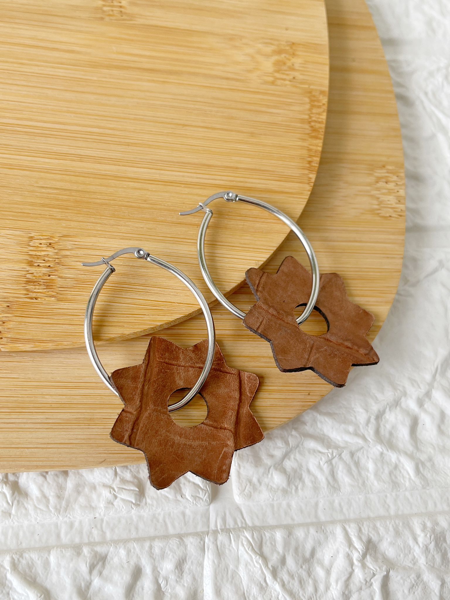 Caravanas de Acero Quirúrgico y Cuero modelo estrella.