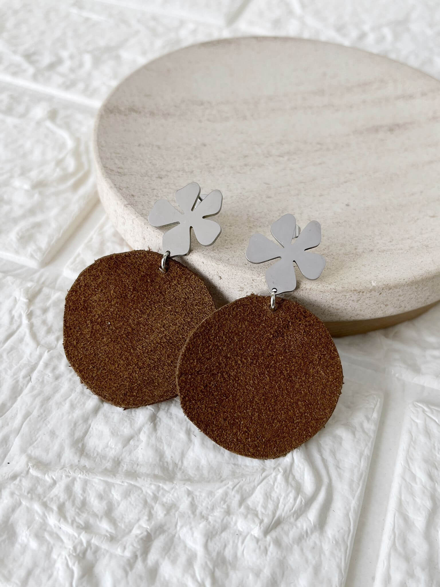 Caravanas modelo Flor de Acero Quirúrgico y Cuero.