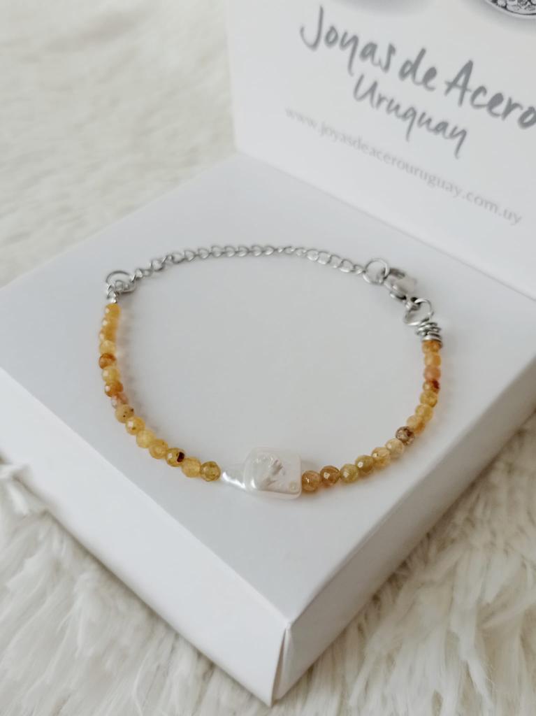 Pulsera de acero Acero, Piedras Naturales Turmalina y Perla de Río.